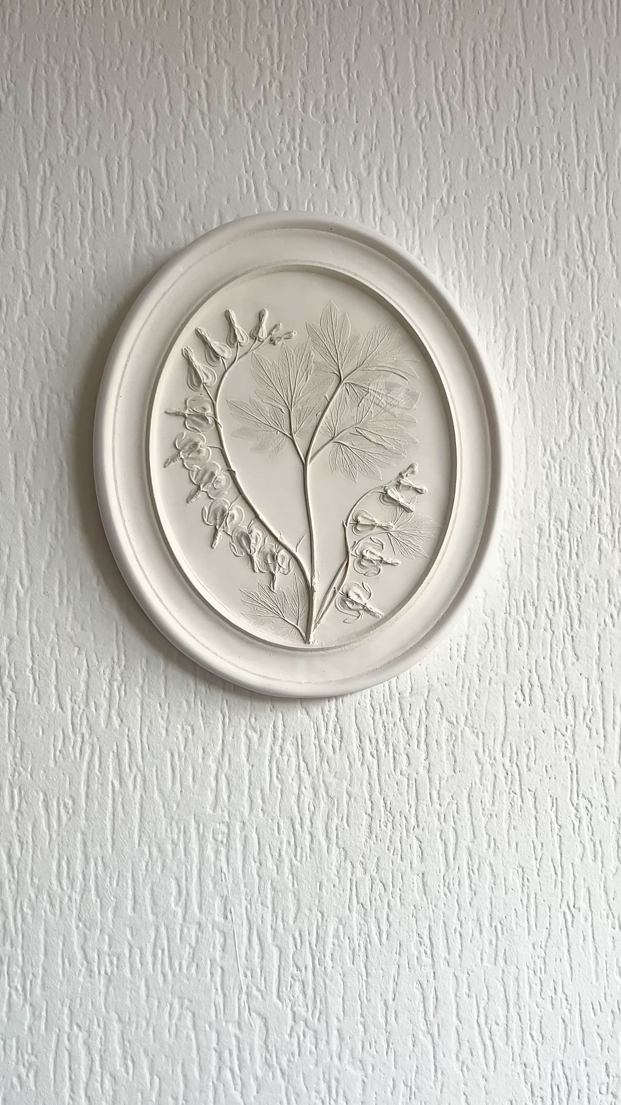 The composition is designed as a framed medallion with a cast plaster frame, where gentle botanical lines create a sense of balance, rhythm, and quiet elegance.