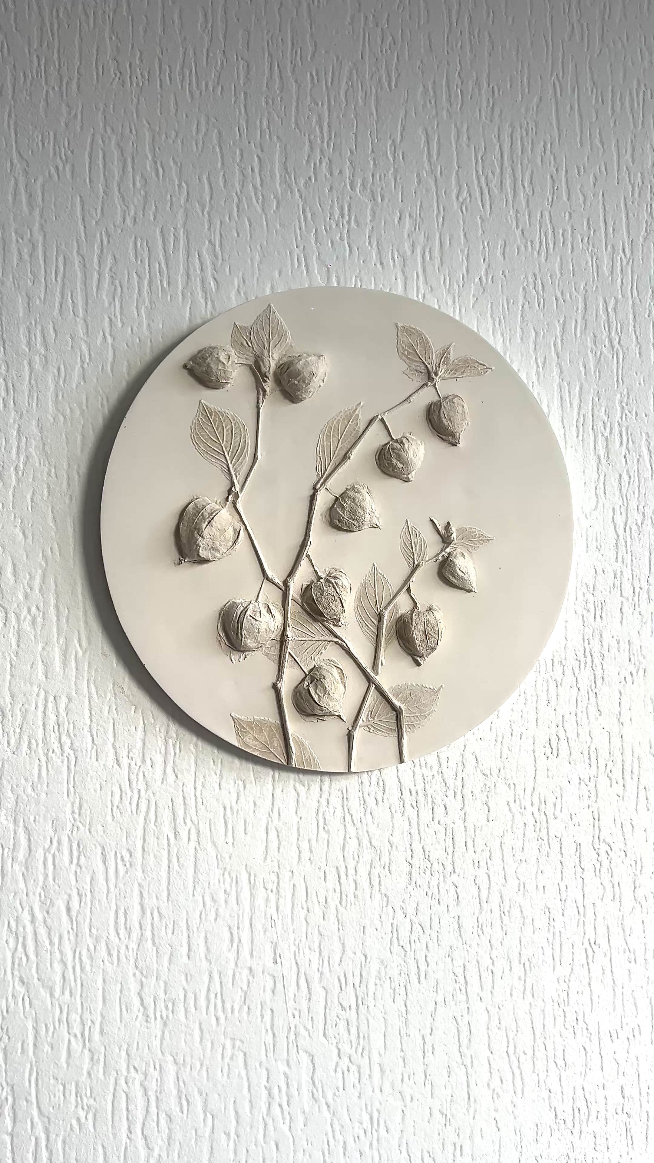 Handmade botanical bas-relief inspired by delicate physalis branches.